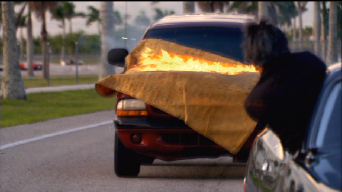 Then Paul ignites the tarp using the flare gun. This was filmed still southbound on Speedway Blvd., but north of the last cut.